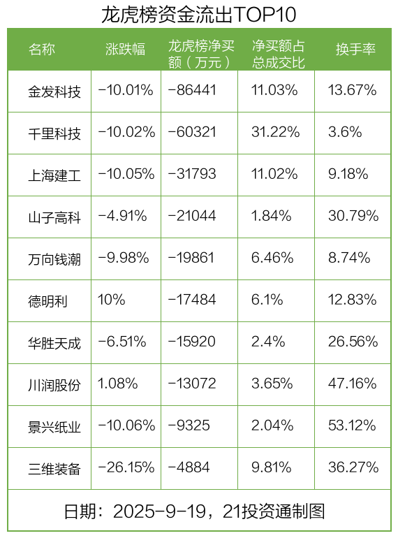 而龙虎榜中资金净流出最多的是金发科技(600143.SH),被净卖出为8.64亿元,占总成交金额的11.03%。金发科技收盘下跌10.01%,换手率为13.67%。