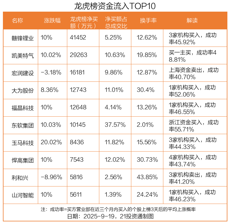 9月19日,上证指数下跌0.3%,深证成指下跌0.04%,创业板指下跌0.16%。盘后龙虎榜数据显示,共有49只个股因当日异动登上龙虎榜,资金净流入最多的是赣锋锂业(002460.SZ),达4.15亿元。