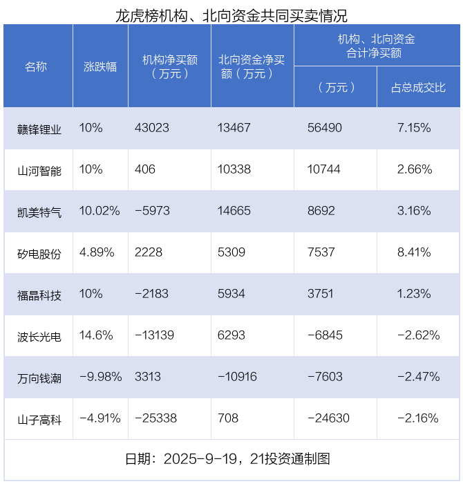 值得注意的是,机构和北向资金共同净买入了赣锋锂业、山河智能、矽电股份等3股;在凯美特气,波长光电,福晶科技,山子高科,万向钱潮上出现分歧,机构净卖出凯美特气5972.57万元,北向资金净买入1.47亿元;机构净卖出波长光电1.31亿元,北向资金净买入6293.47万元;机构净卖出福晶科技2182.73万元,北向资金净买入5933.65万元;机构净卖出山子高科2.53亿元,北向资金净买入707.87万元;机构净买入万向钱潮3312.91万元,北向资金净卖出1.09亿元。