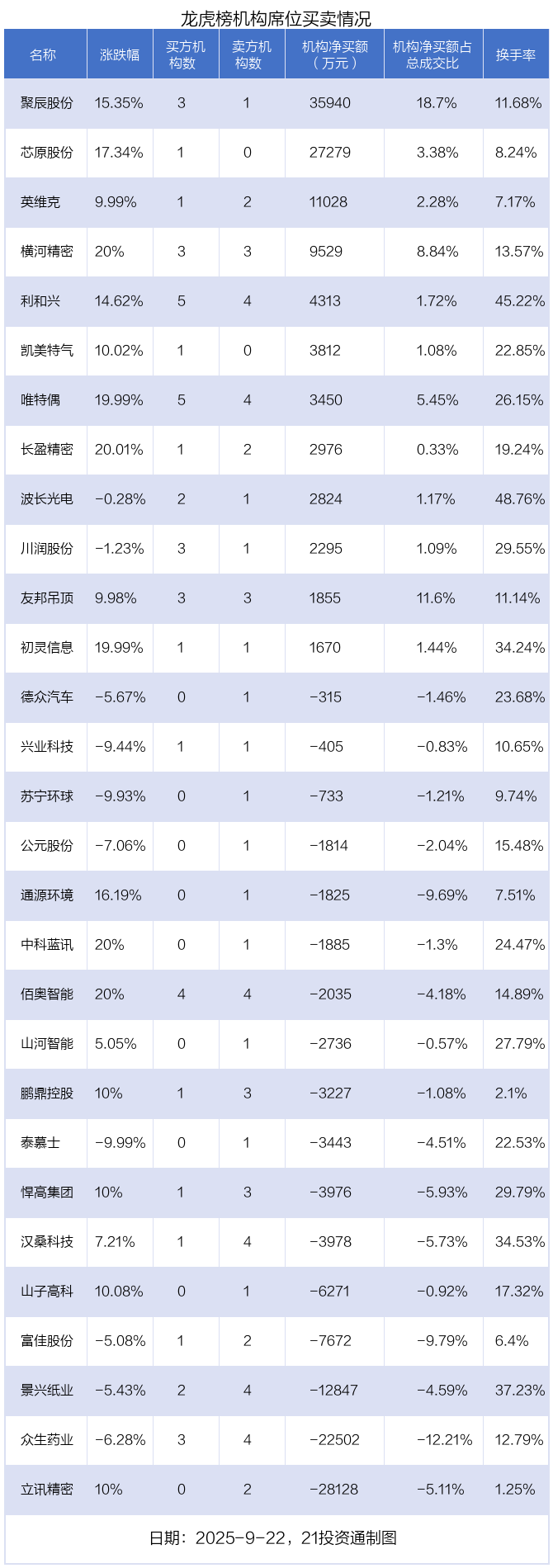 其中,机构净买入金额最多的是聚辰股份(688123.SH),当日收盘上涨15.35%,换手率为11.68%。