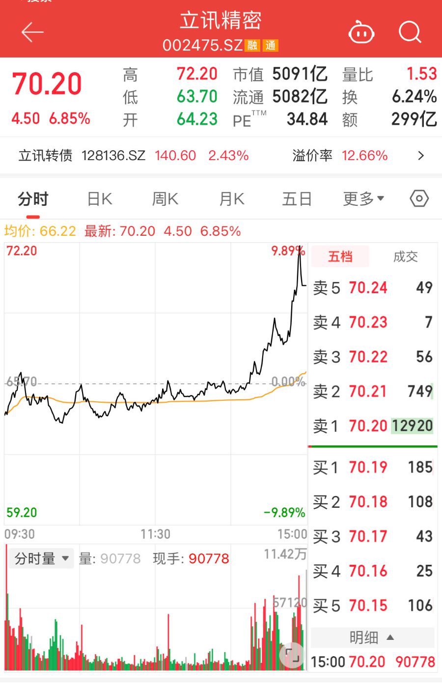 9月24日,果链龙头立讯精密(002475.SZ)股价延续强势表现,尾盘快速拉升至72.29元/股,盘中涨幅达9.89%,再次刷新历史高点,截至收盘,立讯精密股价收涨6.85%,报70.2元/股,总市值突破5000亿元。自9月以来,立讯精密股价涨幅已超50%。