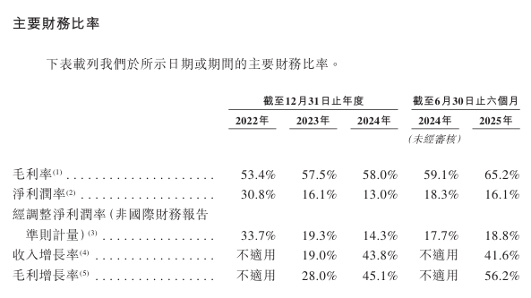 本次提交的招股书数据显示,公司营收从2022年的3.18亿元增长至2024年的5.44亿元,2025年上半年营收进一步增至3.79亿元,同比增幅达42%;利润率方面,毛利率自2022年的53.4%毛利率增长至2025年上半年的65.2%,净利润率却由2022年的30.8%下滑至2024年的13.0%和2025上半年的16.1%。