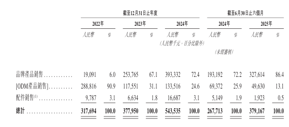 细分到具体业务,从OEM代工逐渐转向自主品牌或许是其在毛利率持续上升的同时,净利润率反而持续下滑的主要原因,招股书数据显示,2022年公司品牌产品销售和ODM产品销售作战收入比例分别为6.0%与90.9%;而到2025上半年,二者的比例已经变化为86.4%与13.1%。