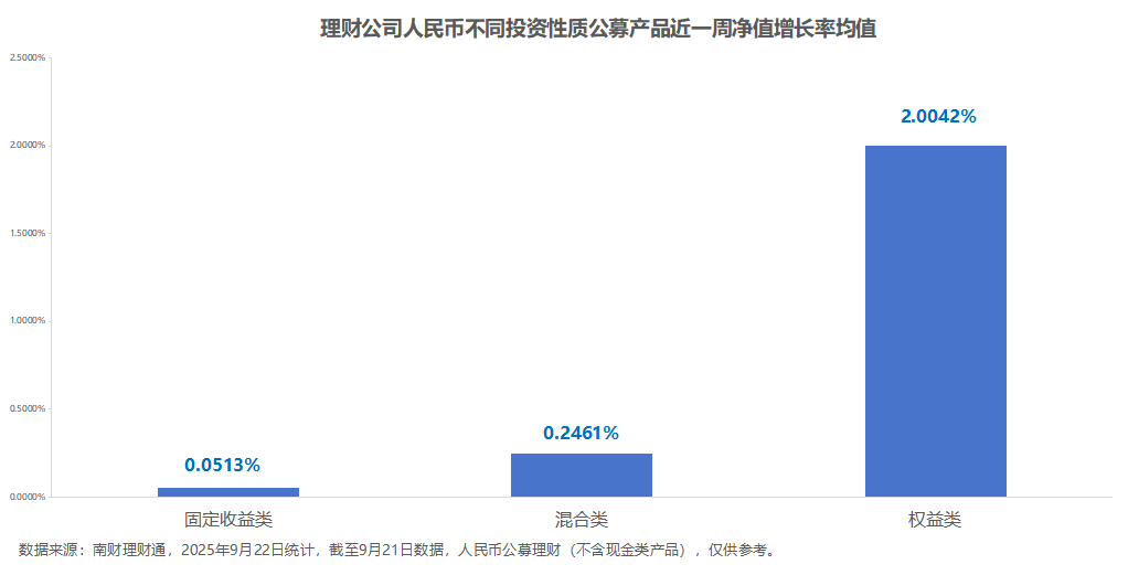 破净产品数量维持在低位。南财理财通数据显示,截至2025年9月21日,理财公司共有26,354只存续公募理财产品,其中285只累计净值低于1,银行理财综合破净率为1.08%。权益类、混合类理财破净率分别为18.37%和3.04%,固定收益类公募理财破净率为0.95%。