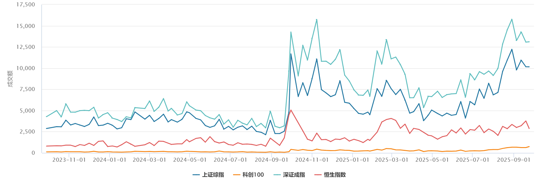 受股指增长的提振,成交额也均实现翻倍。2024年9月24日前一年,上证指数、深证成指、恒生指数、科创100的成交额分别为82.09万亿元、107.13万亿元、25.25万亿元、3.04万亿元;而一年之后的成交额分别为165.91万亿元、240.29万亿元、59.49万亿元、8.07万亿元。