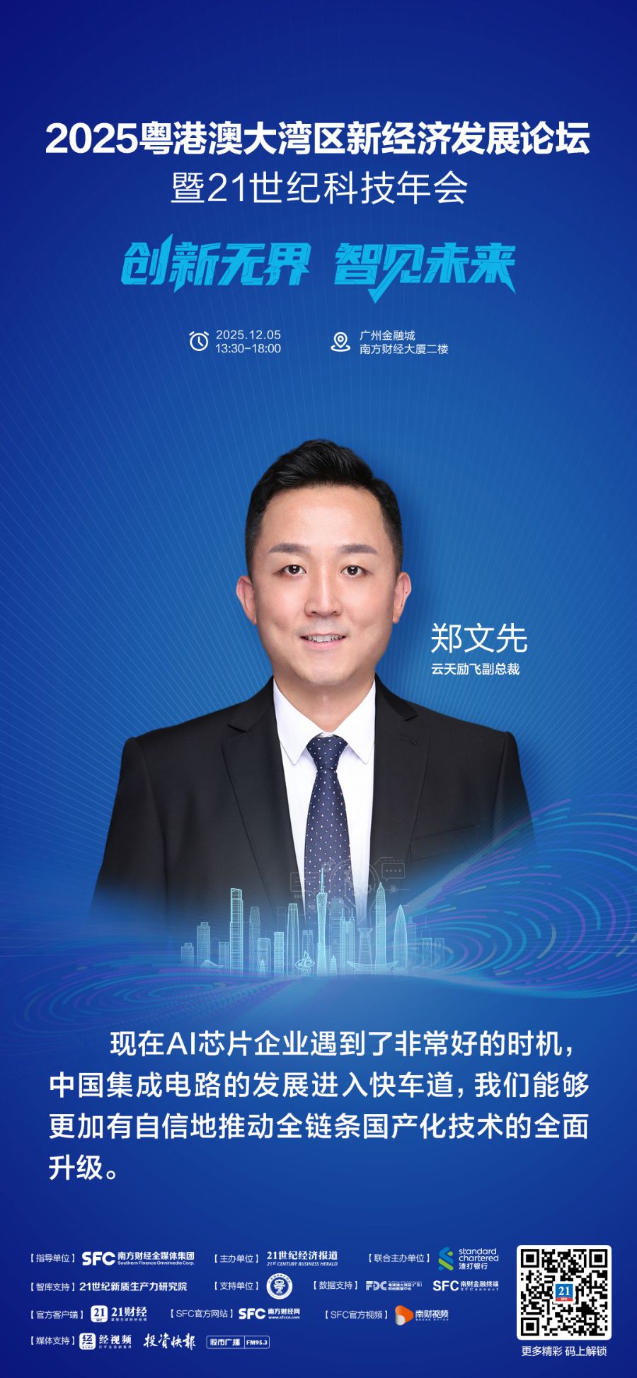 作为“南方财经论坛2025年会”的重要专题会议之一,本届科技年会以“创新无界 智见未来”为主题。论坛期间,在以“AI驱动的新经济图景”为主题的圆桌对话中,云天励飞副总裁郑文先系统分享了他对当前AI发展瓶颈、AI芯片产业机遇的判断。