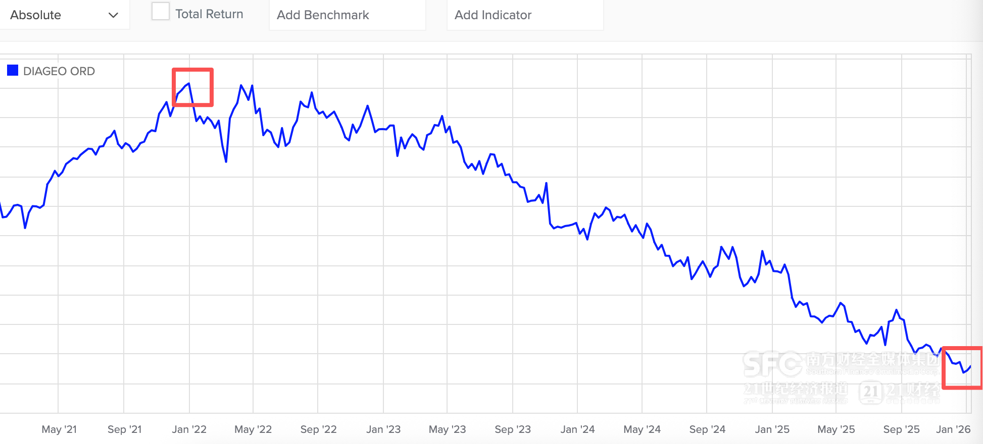 从2023年开始,帝亚吉欧股价明显就进入了下行通道,目前股价相较于2021年末历史最高点已经跌去了近60%。