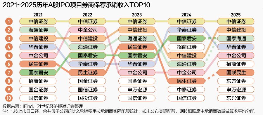 2021-2025年,A股IPO保荐承销费用收入的第二名分别是海通证券、中金公司、中信建投、华泰证券和中信建投。
