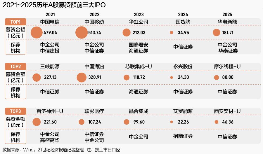 中金公司依然占据着“国家队”项目的生态位。近五年的年度最大IPO项目中,中金公司参与了其中3单的保荐工作,包括2021年的中国电信、2022年的中国移动和2025年的华电新能。在协调资金需求巨大、结构复杂的国家级和战略级项目上,其优势依旧稳固。