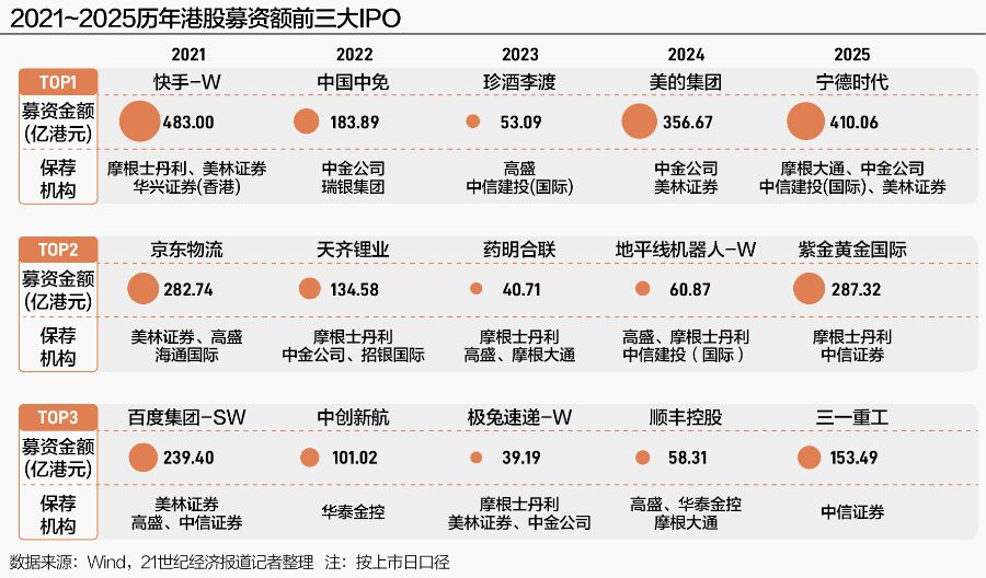 2021年,港股IPO募资额榜首被快手、京东物流、百度集团等互联网平台占据。此后的两年,消费、新能源、医药等领域公司IPO“百花齐放”,却缺乏能够真正引领市场的明星项目。