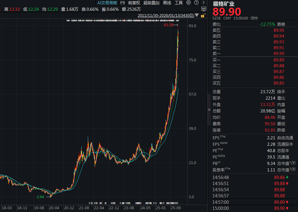 叠加铜价上涨的刺激,藏格矿业在2025年再次取得了210.16%的可观涨幅,公司股价亦升至90元附近。