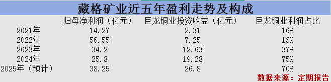 历史数据显示,2023年藏格矿业净利润34.19亿元,同比下滑幅度不足40%,其中对巨龙铜业确认的投资收益大幅增加5.71亿元至12.63亿元;2024年,公司确认的上述投资收益进一步增加至19.28亿元,利润贡献比例达到74.73%。