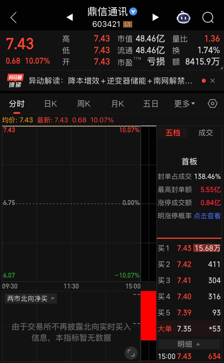 9月19日,鼎信通讯(603421)开盘即涨停,报7.43元/股,为年内第二次涨停,且为“一字板”,引发市场关注。