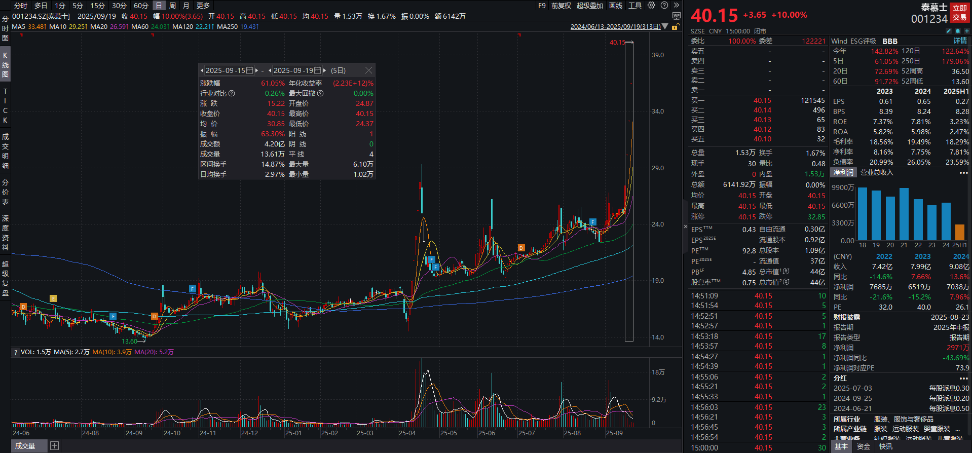 二级市场方面,近一周,泰慕士连收5个涨停板,累计涨幅超61%,9月19日盘中价格报40.15元/股,创2022年2月以来新高。