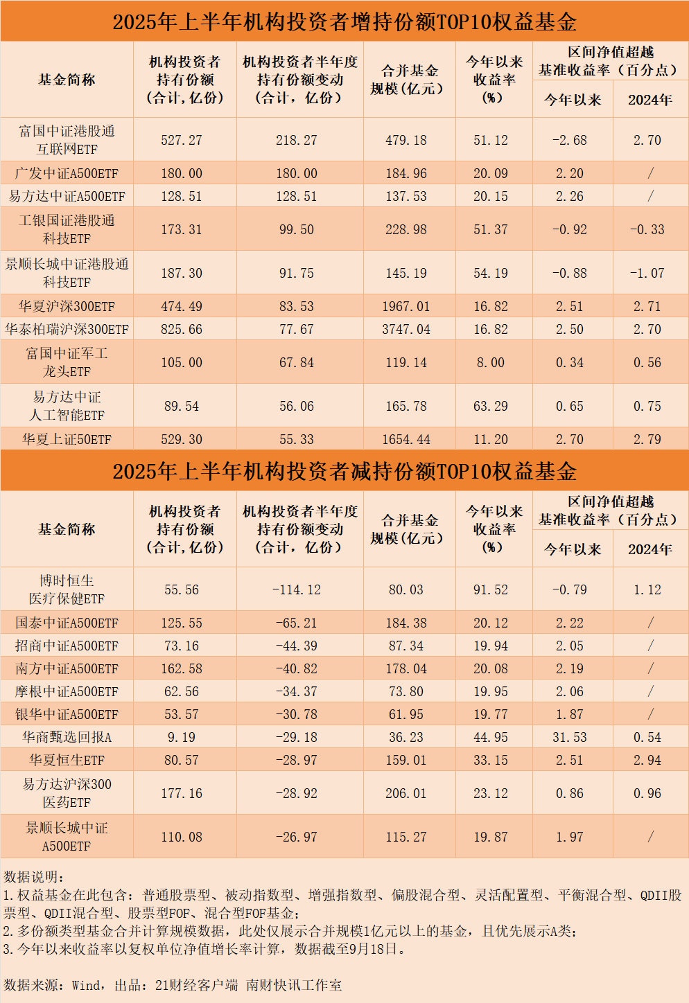2025年上半年,宽基ETF成为机构们重金持有的主流。截至上半年末,机构投资者持有金额最高的20只权益类基金均为ETF产品,且宽基ETF占据绝大多数。