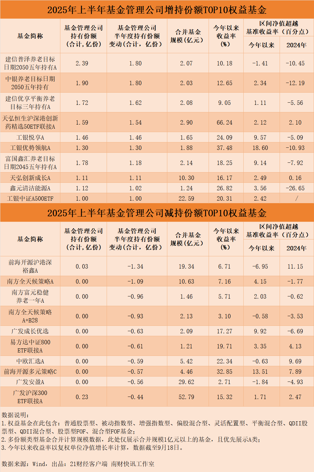 此外,上半年基金管理公司减持份额TOP10权益基金中,广发成长优选、易方达中证800ETF联接A、中欧汇选A、前海开源多元策略C、广发安盈A等5只基金也遭“清仓式”减持。