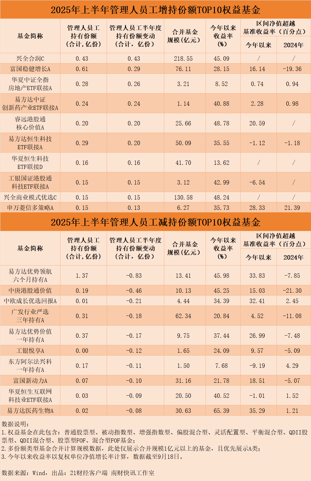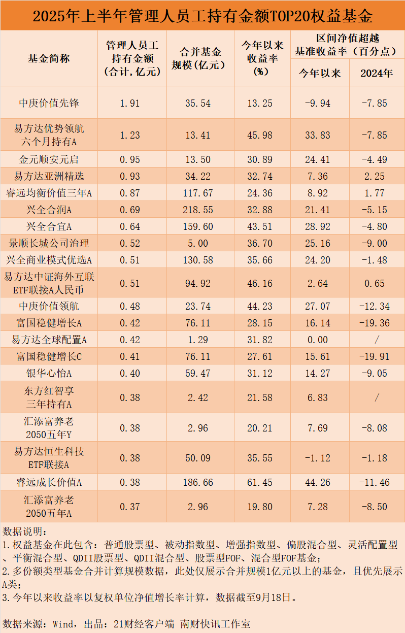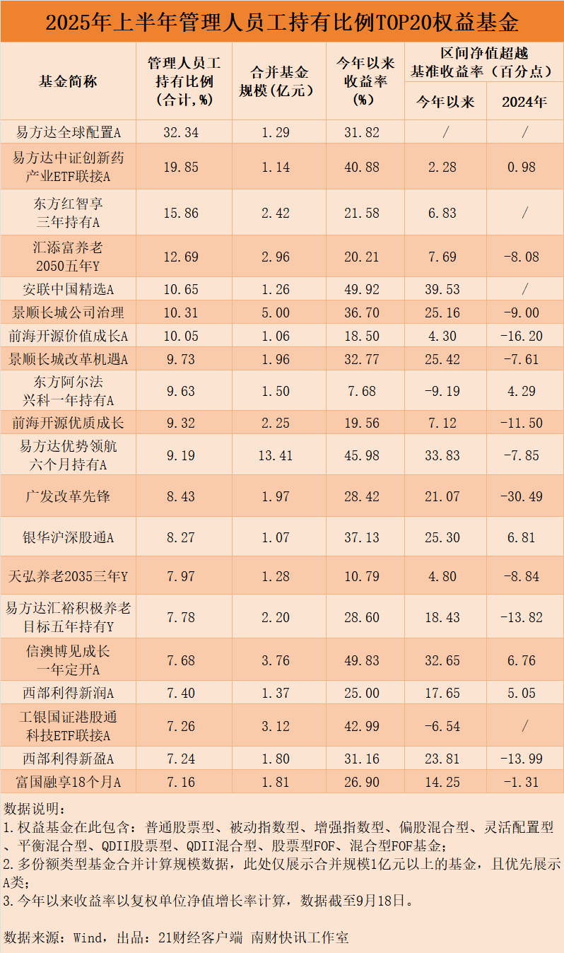 上半年,员工持有比例居前20位的权益基金整体呈现规模偏小的特征,多数产品规模不足2亿元。从业绩表现来看,相较于2024年全年,榜单中多数基金今年以来业绩跑赢基准的幅度实现显著提升。从具体的产品选择来看,“内部人”中既有追求均衡配置的“稳健派”,也有偏好高景气赛道的“成长派”。