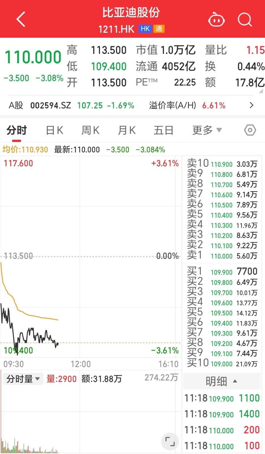 9月22日,比亚迪股份(01211.HK)低开,截至11点18分,报110港元/股,跌超3%。消息面上,“巴菲特清仓比亚迪”话题登上微博热搜,引发广泛关注。