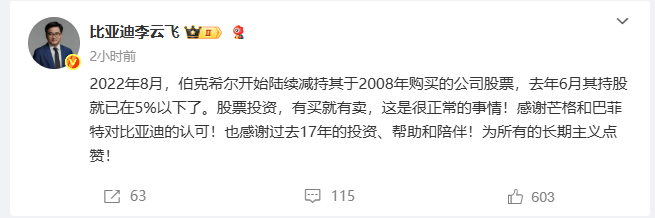 对此,9月22日上午,比亚迪集团品牌及公关处总经理李云飞发文回应称,2022年8月,伯克希尔开始陆续减持其于2008年购买的公司股票,去年6月其持股就已在5%以下了。“股票投资,有买就有卖,这是很正常的事情。感谢芒格和巴菲特对比亚迪的认可,也感谢过去17年的投资、帮助和陪伴,为所有的长期主义点赞。”
