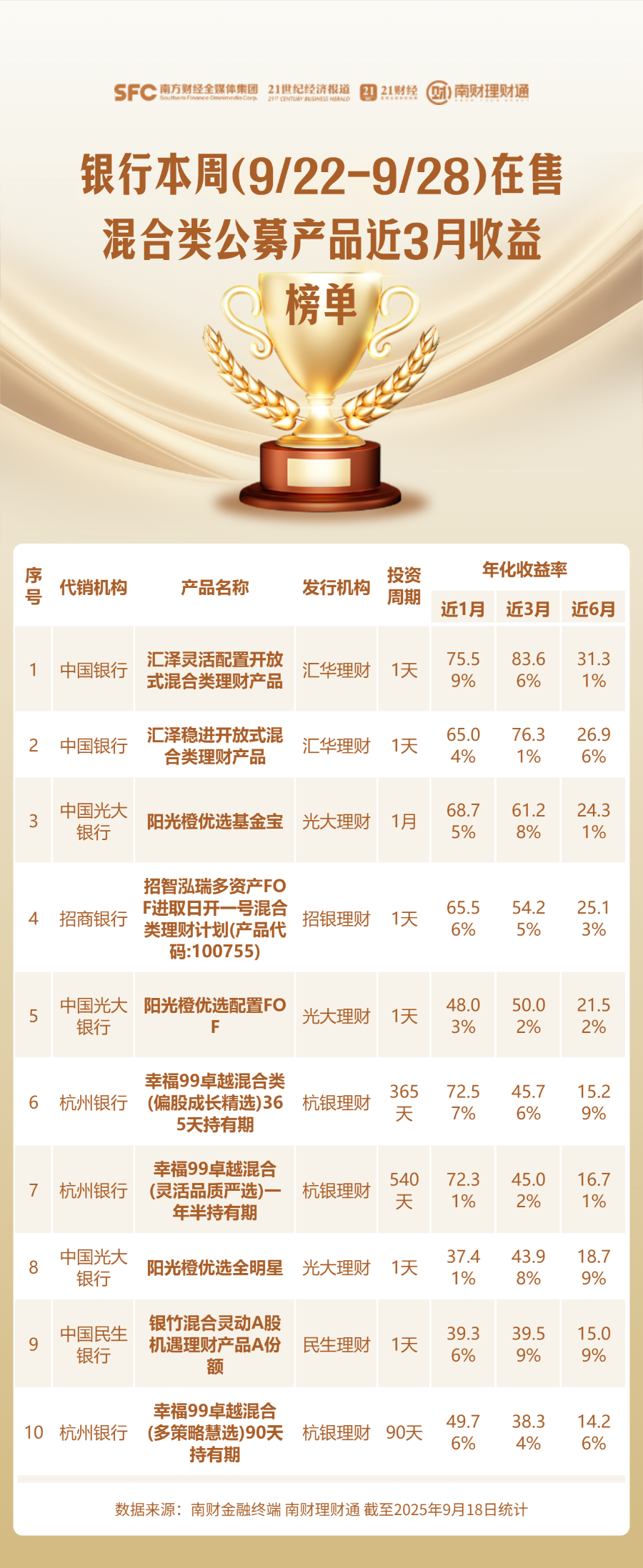 编者按:当前银行理财货架产品琳琅满目,诸如“增强”“稳健”“均衡”等名称相近、特征模糊的产品层出不穷,投资者应如何甄别与选择?为降低投资者的选择成本,南财理财通课题组从代销机构角度入手,聚焦各渠道当周在售的理财产品,搜罗其中业绩表现优异者,并发布代销产品业绩榜单。