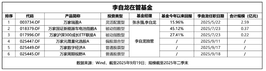 9月15日起,万家基金连续发行两只普通股票型基金——万家数字经济与万家周期视野,认购期均仅为1天,拟任基金经理均为李自龙。这两只基金已于9月17日及18日先后成立。