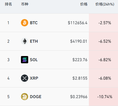 加密货币快速下挫,以太坊一度下挫逾9%跌破4100美元,截至15时,比特币跌超2.5%,现报112656美元。