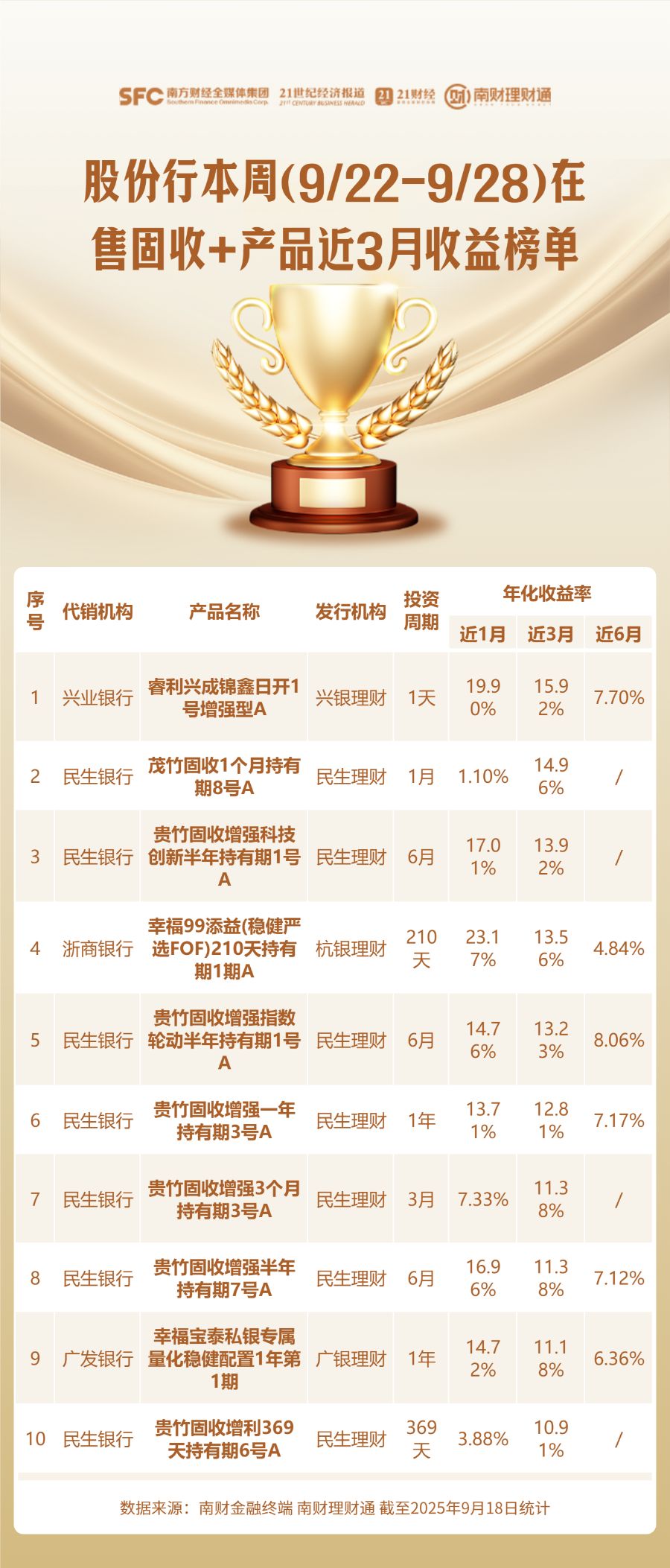 编者按:当前银行理财货架产品琳琅满目,诸如“增强”“稳健”“均衡”等名称相近、特征模糊的产品层出不穷,投资者应如何甄别与选择?为降低投资者的选择成本,南财理财通课题组从代销机构角度入手,每周聚焦各渠道当周在售的理财产品,搜罗其中业绩表现优异者,并发布代销产品业绩榜单。