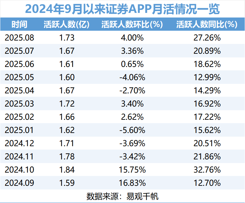易观千帆数据显示,8月证券APP活跃用户规模达1.73亿人,环比增长4%,同比大增27.26%,月活人数不仅刷新2025年单月最高纪录,更创下“9・24”行情以来的第三高位,仅次于2024年10月的1.84亿人、11月的1.78亿人。