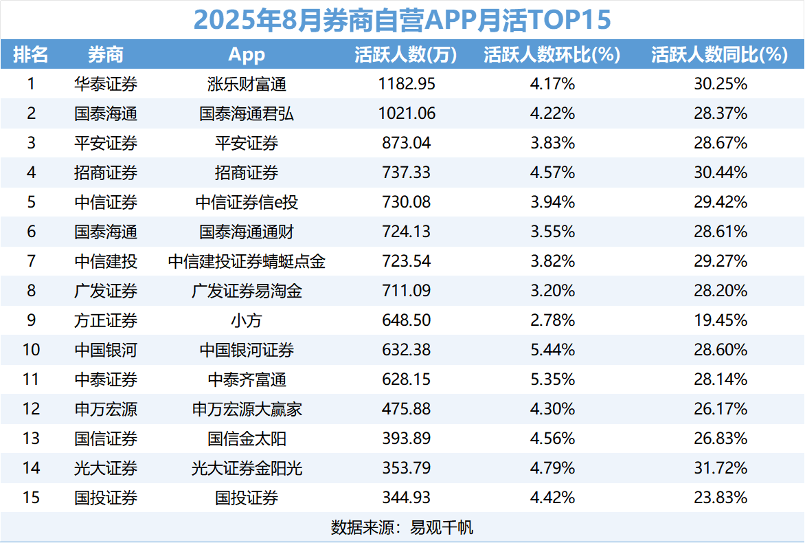 易观千帆公布的最新数据显示,8月证券APP月活跃用户规模达1.73亿人,环比增长4%,同比大增27.26%,不仅刷新2025年单月最高纪录,更创下“9・24”行情以来的第三高位。