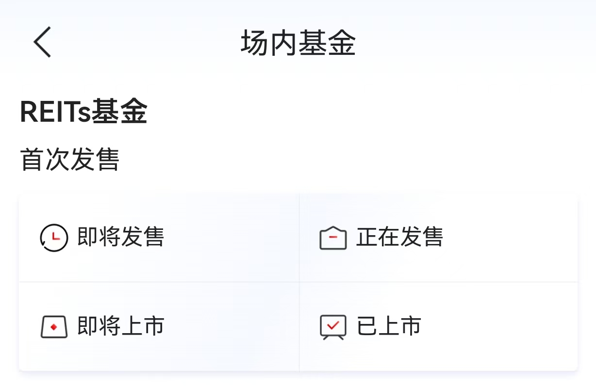 然后在首页点“交易”,再点“场内基金”,就可以看到了,可以看到“即将发售”“正在发售”“即将上市”和“已上市”的REITs基金。“正在发售”的REITs基金就是可以打新的REITs基金。具体发售时间要看REITs基金的公告。