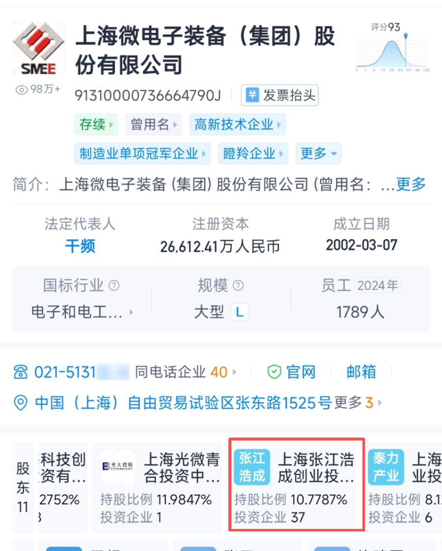 天眼查信息显示,张江高科通过全资子公司上海张江浩成创业投资有限公司持有上海微电子10.78%的股权,初始投资额约2.23亿元。