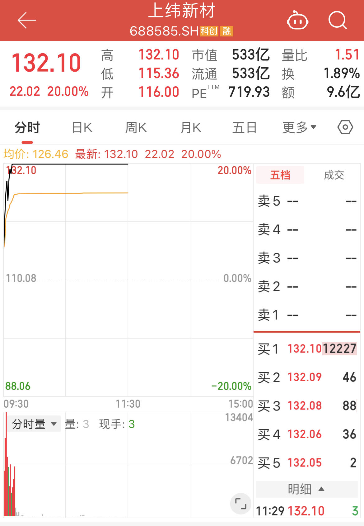 9月25日早盘,上纬新材(688585.SH)开盘不久便封死20cm涨停,股价飙升至132.1元/股,创历史新高。