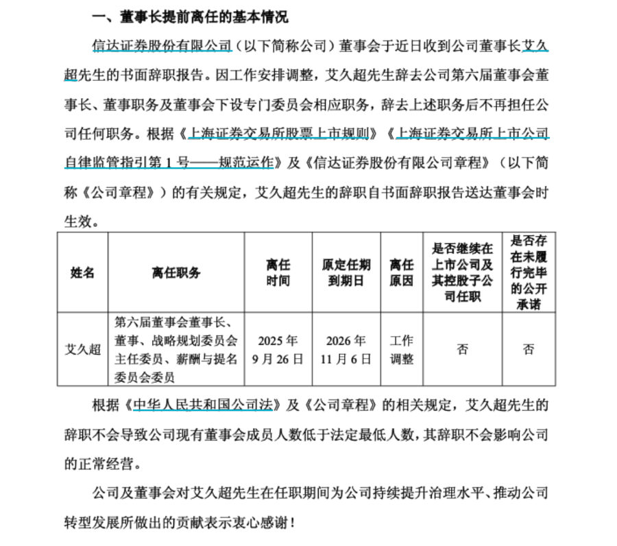 原董事长艾久超今年58岁,出任信达证券掌门人接近五年,任期原本将于2026年11月结束,此次提前离任是因工作安排调整。辞任后,艾久超不再担任信达证券任何职务。