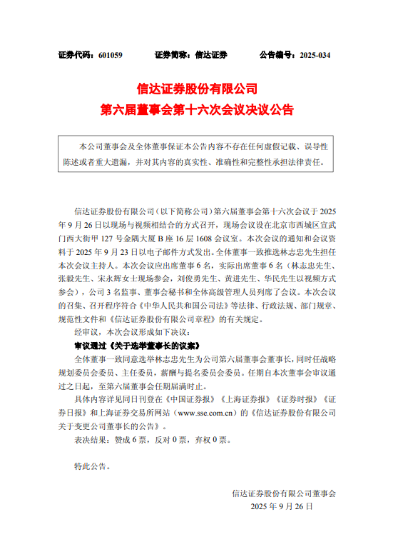 随后,9 月 26 日,信达证券又召开第六届董事会第十六次会议,同意选举林志忠为公司第六届董事会董事长,同时任战略规划委员会委员、主任委员,薪酬与提名委员会委员。