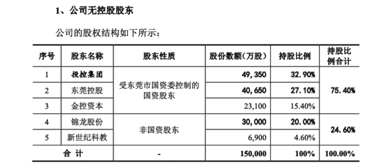 目前,东莞市投控集团、东莞控股、锦龙股份、东莞金控资本、东莞市新世纪科教拓展有限公司分别持有东莞证券32.90%、27.10%、20%、15.40%、4.60%的股份。