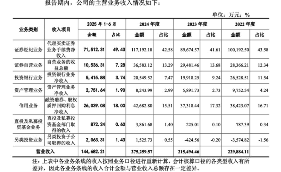 根据招股书,2022年度、2023年度、2024年度及2025年1—6月,东莞证券旗下证券经纪业务产生的代理买卖证券业务手续费净收入分别为100192.50万元、89674.57万元、117192.18万元及71512.31万元,占公司同期营业收入的比例分别为43.58%、41.61%、42.58%及49.43%。