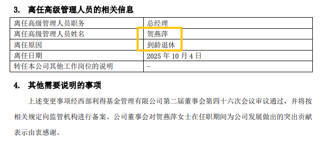 10月10日,西部利得基金公告称,贺燕萍因到龄退休,已于2025年10月4日离任总经理一职,由董事长何方代任总经理。