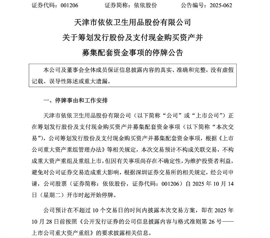 10月13日晚,依依股份(001206.SZ)发布停牌公告,公司称正筹划发行股份及支付现金购买资产并募集配套资金事项,筹划事项的交易标的为杭州高爷家有好多猫宠物食品有限责任公司(下简称高爷家),预计在不超过10个交易日的时间内,即在10月28日前披露本次交易方案。