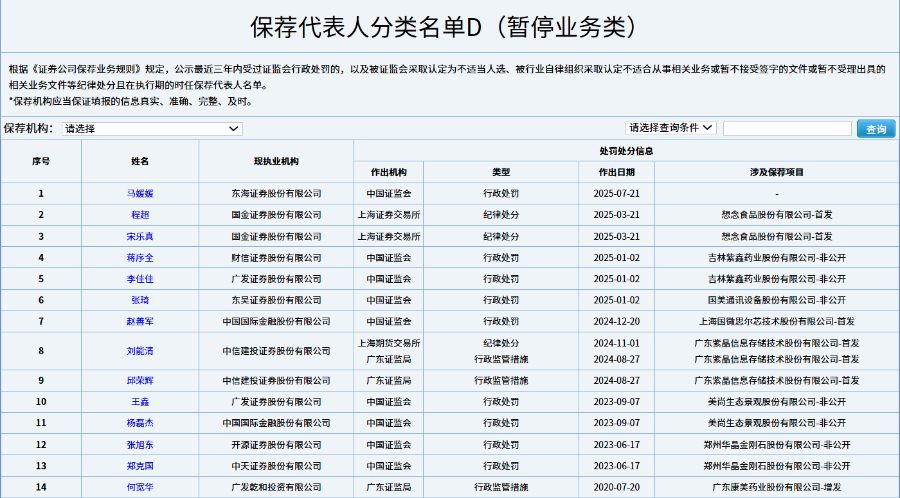 中国证券业协会官网信息显示,截至10月22日,已有14名保代被记入D类名单,东海证券、国金证券、财信证券、广发证券、东吴证券、中金公司、中信建投、开源证券等多家券商的保代均在其中。