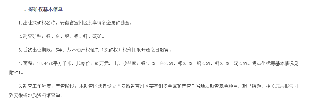 综合出让公告等多方资料显示,茶亭铜多金属矿勘查矿种包括铜、金、银、铅、锌、硫矿。该矿是国家地质找矿358突破战略行动安徽省重点项目,已查明资源储量规模达到大型。