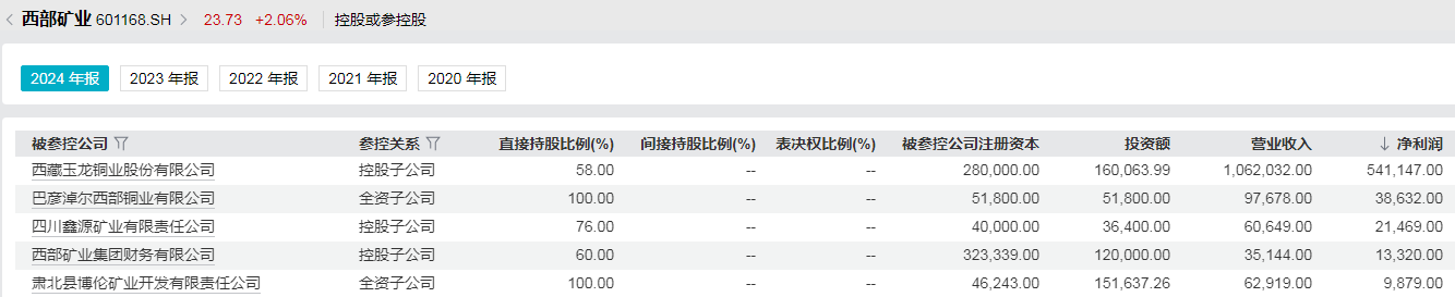过去几年,在自身扩产、铜价上涨的双重拉动之下,玉龙铜矿盈利规模持续提升,2024年营收、净利润分别突破100亿元和50亿元,利润规模远超西部矿业其他子公司。
