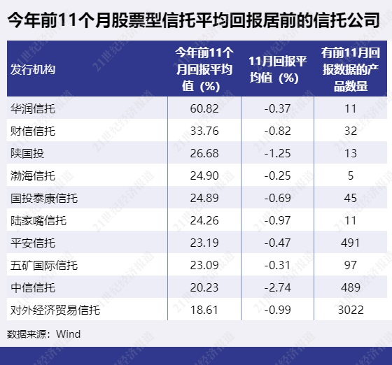 财信信托、陕国投的股票型信托平均回报依然分别排第二、第三,前11个月平均回报分别为33.76%、26.68%。