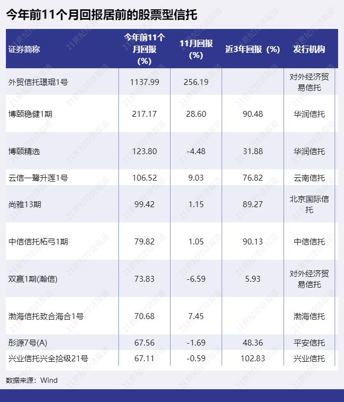 股票型信托产品中今年前11个月回报最高的是“外贸信托璟琨1号”,该产品10月和11月回报均可观。