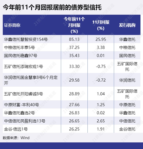 今年前11个月回报最高的依然是“华鑫信托慧智投资154号”。排第二的是“中粮信托丰泰5号”,该产品11月净值继续上涨,前11个月回报为37.25%。“国民信托稳鑫97号”以35.43%排第三。