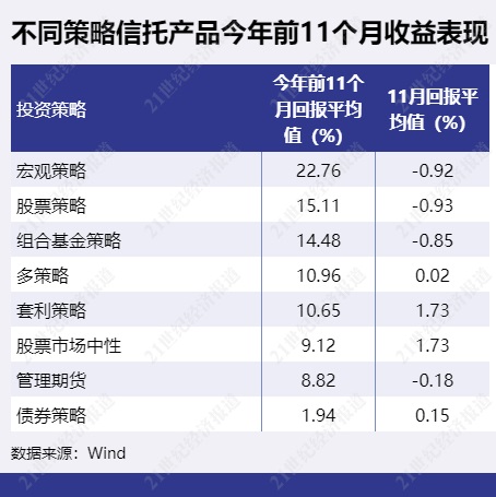 信托产品11月表现较佳的策略有股票市场中性策略、套利策略等。债券策略、多策略等也勉强实现了正收益。宏观策略、股票策略等平均收益为负。