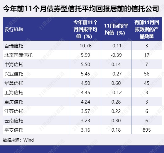 有4家信托公司的债券型信托产品今年前11个月平均回报超过5%。平均回报最高的信托公司为百瑞信托,前11个月平均回报为10.76%。北京国际信托排第二,平均回报为5.99%,中海信托排第三,平均回报为5.5%。