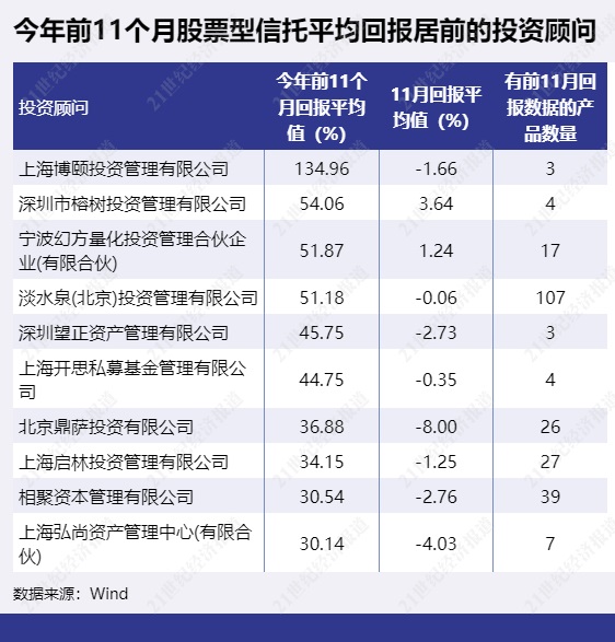 股票型信托产品中有不少为阳光私募,此类产品由私募基金担任投资顾问。若以投资顾问统计收益表现,前11个月平均回报最高的是投资顾问为上海博颐投资管理有限公司,股票型信托平均回报为134.96%。