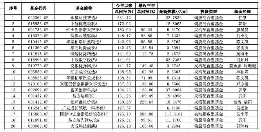 统计数据显示,在这一轮行情中,九成以上主动权益类基金年内实现正收益,其中有超50只基金净值翻倍,永赢科技智选A以高达231.72%收益领跑,遥遥领先其他基金,基本提前锁定今年的冠军宝座。