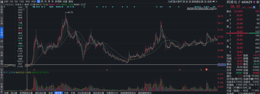 截至2025年12月24日收盘,利通电子最新股价报26.87元/股,年内涨幅达35.84%,总市值达70.50亿元。截至25日上午11时,该公司股价微跌1%。