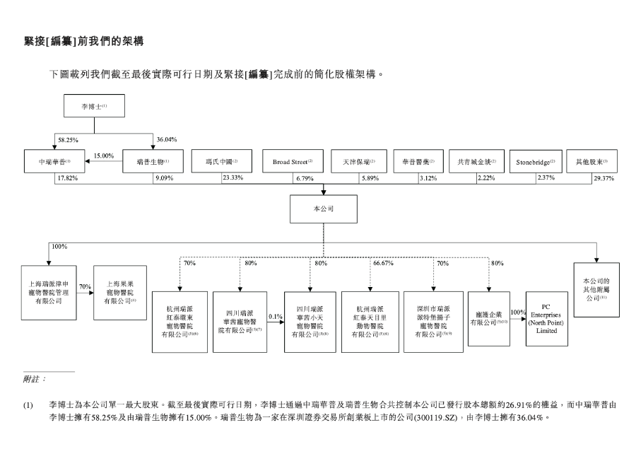 股权结构上,瑞派宠物医院董事会主席李守军(创始人)是公司单一最大股东,其通过中瑞华普和瑞普生物间接控制公司26.91%的股权。